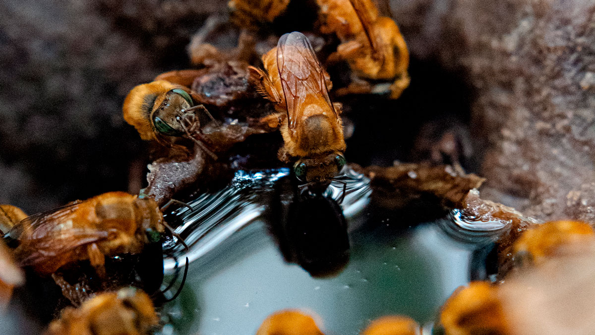 Abelhas Uruçú-amarela (Melipona cf. rufiventris) reunidas para alimentação em um pote de mel.